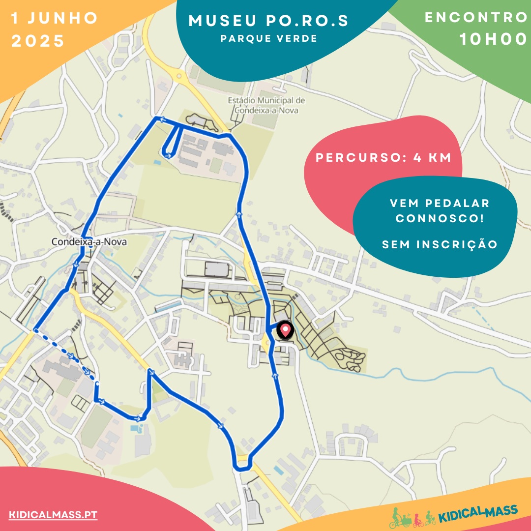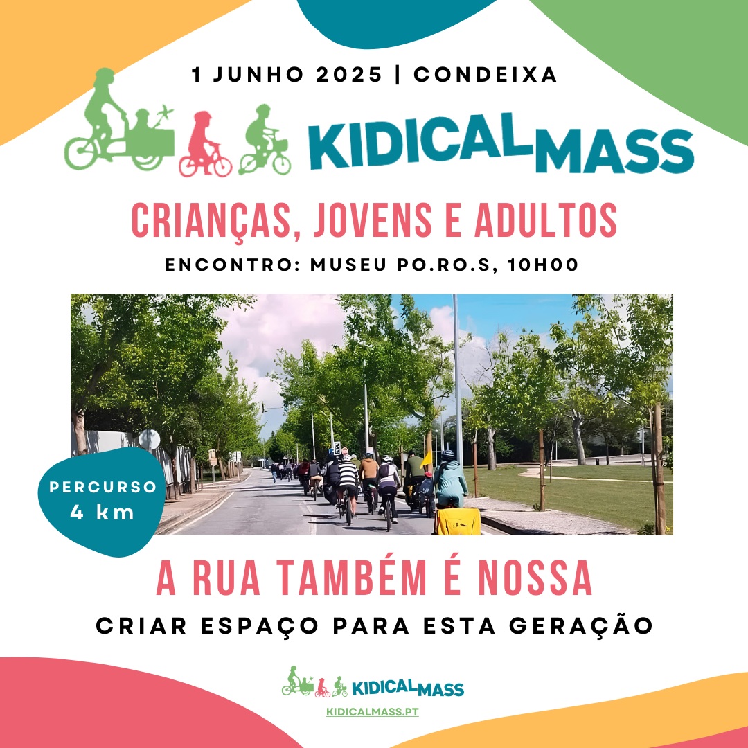 No próximo dia 1 de junho (domingo) — Dia da Criança! — a Kidical Mass regressa a Condeixa pela 3.ª vez. Inspirado na Massa Crítica (pedalar em grupo por mais espaço público seguro), a Kidical Mass é um evento internacional protagonizado por crianças que procura tornar as ruas mais amigas das crianças (e de todos) através da chamada de atenção para a necessidade de se criarem condições para estas se poderem deslocar de bicicleta e a pé em segurança.O encontro é no museu PO.RO.S às 10:00h. Daí faremos um percurso de bicicleta fácil passando pelas escolas e pela Praça da República regressando novamente ao ponto de partida. Não é necessária inscrição. Contamos convosco!Na véspera, sábado, dia 31 de maio, na Biblioteca Municipal, teremos uma atividade para os mais pequenos que junta leitura, criatividade e cidadania ativa! Mais informações em breve. Não faltem!! kidical-mass